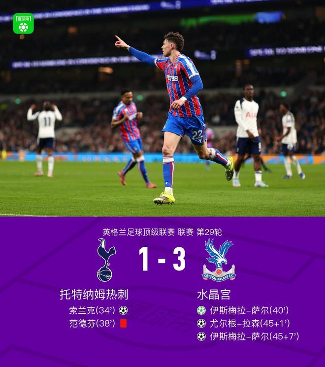 北京时间3月6日英格兰足球顶级联赛 联赛 第29轮,托特纳姆热刺主场对阵水晶宫。上半场,阿奇-格雷助攻索兰克破门。范德芬拉倒萨尔送点并且被直红罚下,萨尔罚入点球扳平比分。沃顿送出两次助攻,拉森和萨尔相继建功。下半场,两队均无建树。全场比赛结束,热刺1-3不敌水晶宫,遭遇各项赛事的5连败和英超连续11轮不胜。