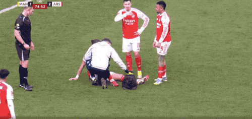 第75分钟,卡拉菲奥里大脚解围过后,直接坐在地上,疑似肌肉出了问题,无法坚持,被萨卡换下。